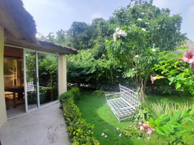 La villa en vente comprend également une pièce avec de grandes baies vitrées donnant sur le magnifique jardin arboré de manguiers et plein de fleurs .